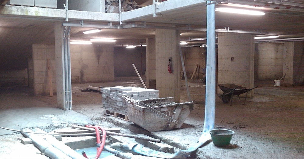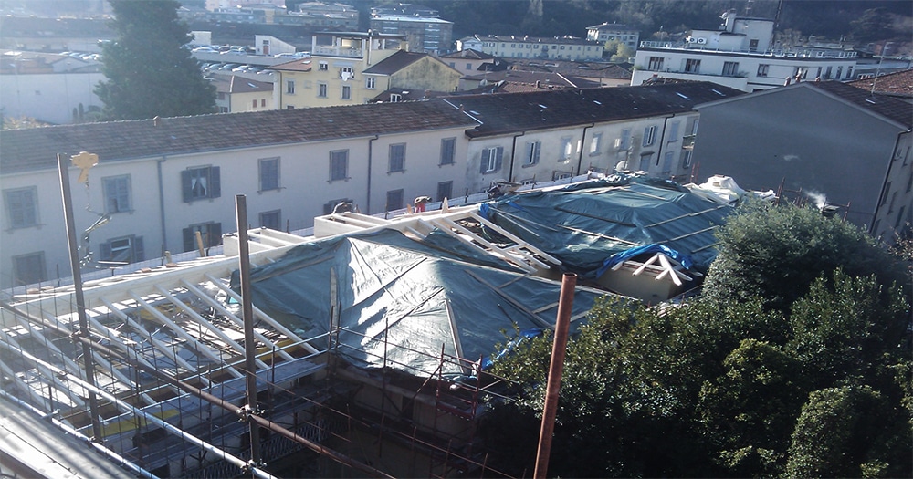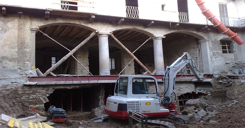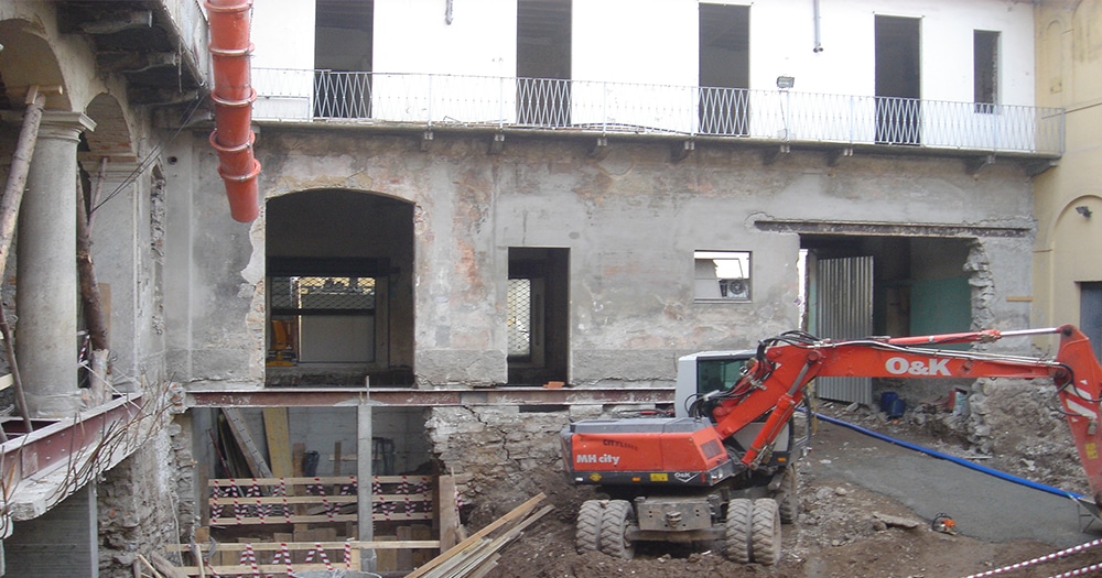 Formazione di due piani interrati di autorimesse con sottomurazioni marciavanti, ristrutturazione completa di strutture, copertura, opere murarie e assistenze per formazione unità residenziali di pregio, aree direzionali e commerciali.