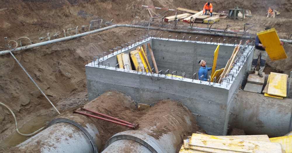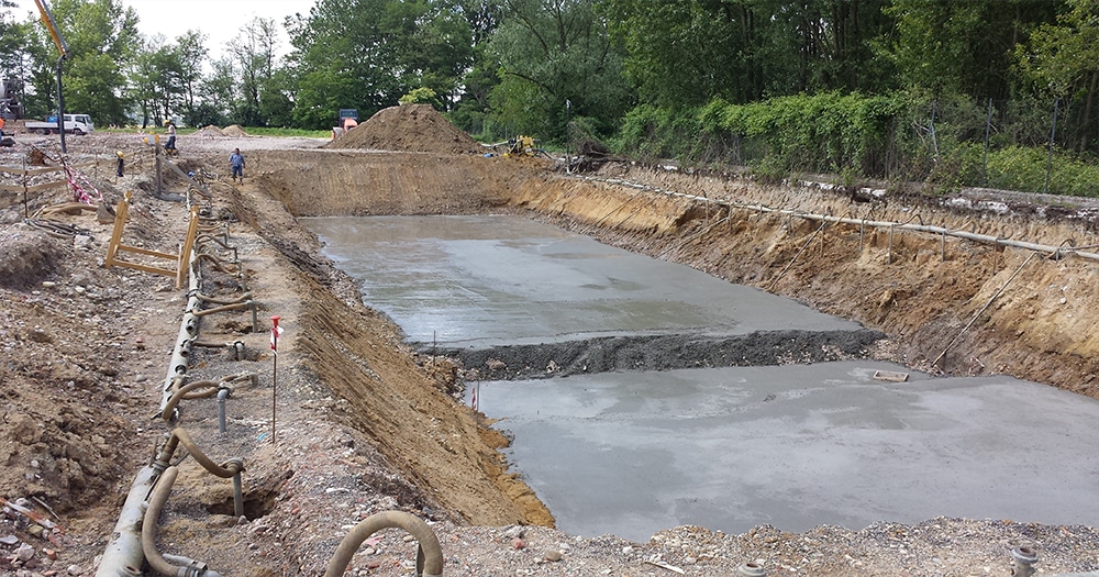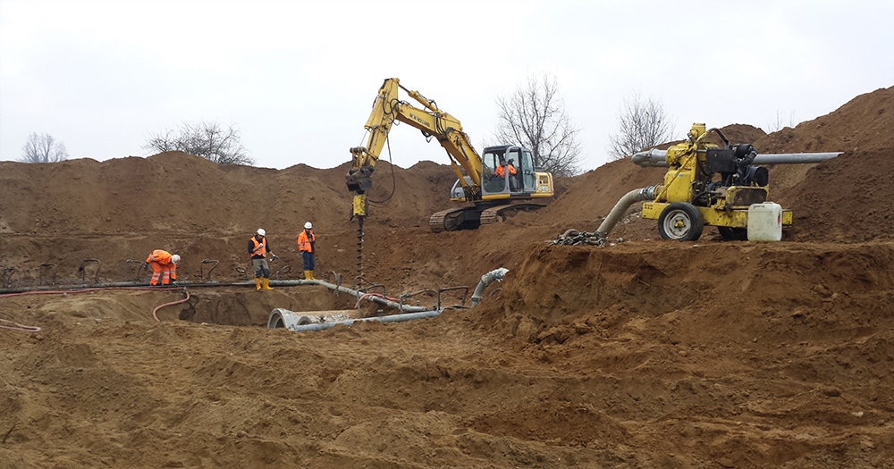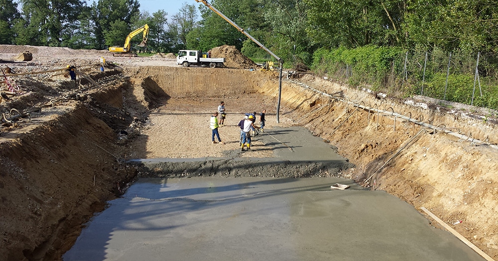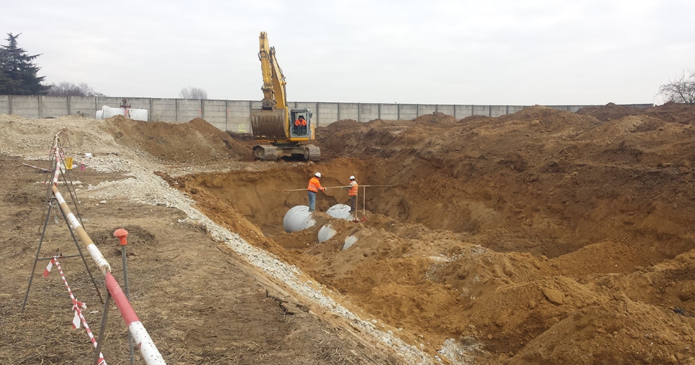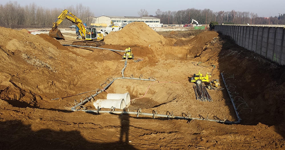 Costruzione di condotte per deviazioni roggia intergerente con l’area di cantiere con la posa di impianto well-point per aggottamento acqua di falda, formazione di camerette in opera e posa tubazioni in cemento armato in c.a. diametro 100cm.